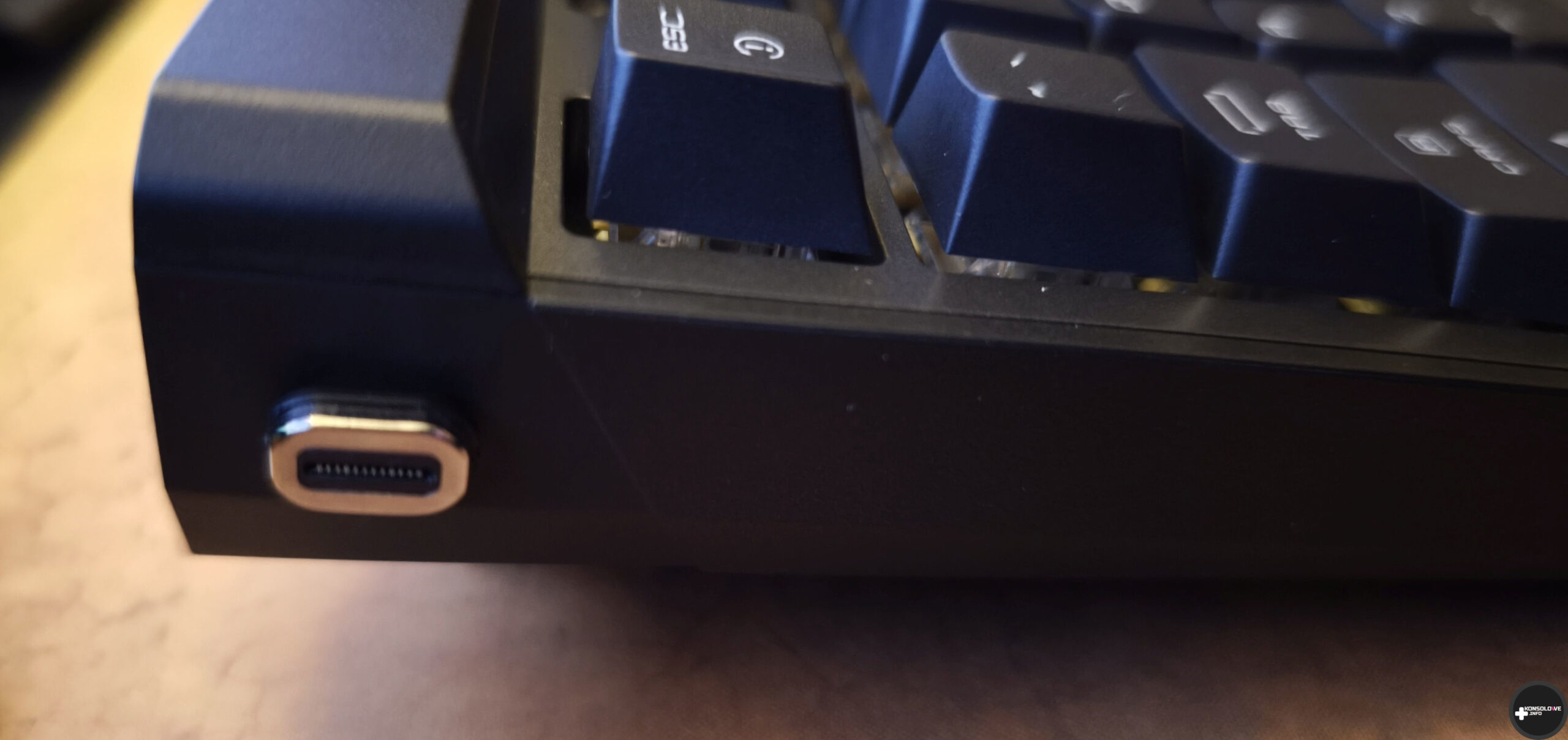 Po lewej stronie, na górze, znajdziemy port USB typu C. Możemy oczywiście umieścić w nim standardowy kabel, aczkolwiek ja uważam, że zdecydowanie należy dać szansę dołączonemu wtykowi USB C. Jest on zakończony magnesem, wobec czego bardzo fajnie można go połączyć z kablem z zestawu jeśli chcemy korzystać z klawiatury w ten sposób. Muszę zaznaczyć, że wtyk siedzi w klawiaturze bardzo mocno i chcąc go wyciągnąć, należy użyć niemałej siły. Nie sądzę jednak, aby było to konieczne dla wielu czytelników naszego portalu. Na dobrą sprawę możecie zapomnieć o wyciąganiu wtyku po umieszczeniu go w porcie.