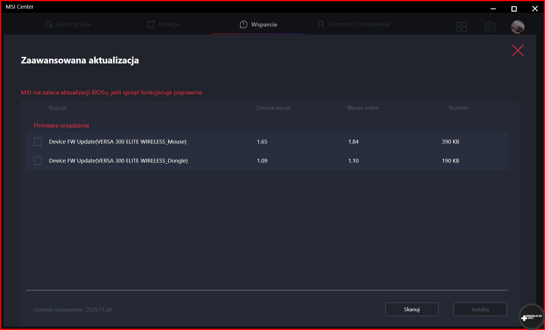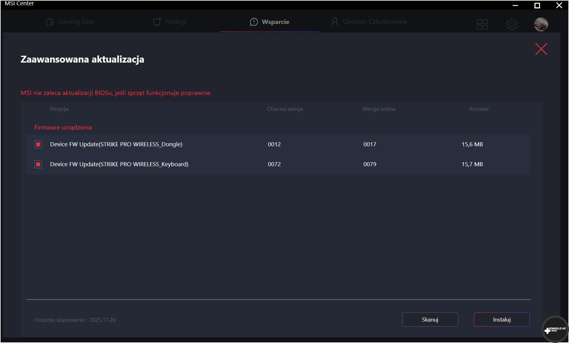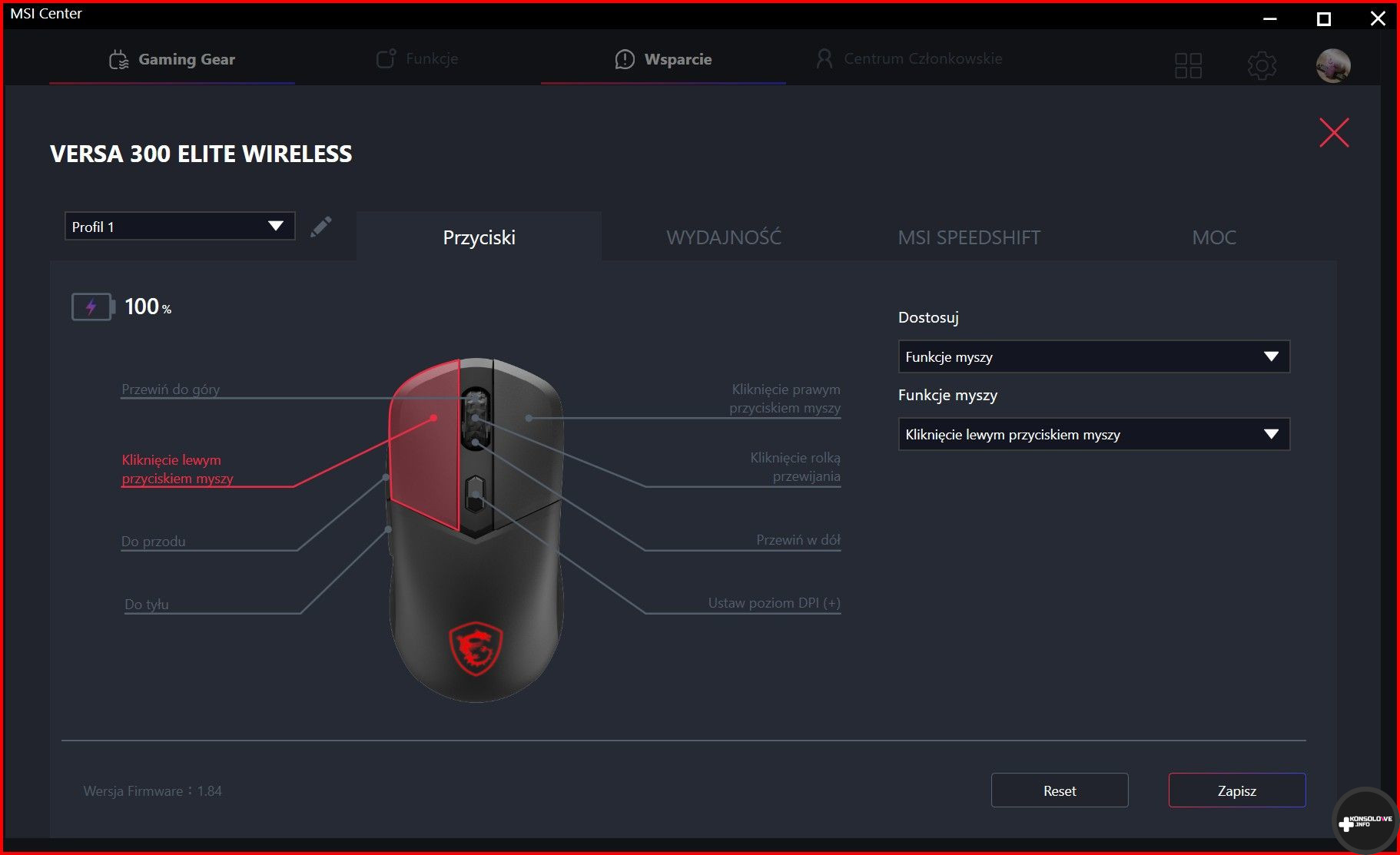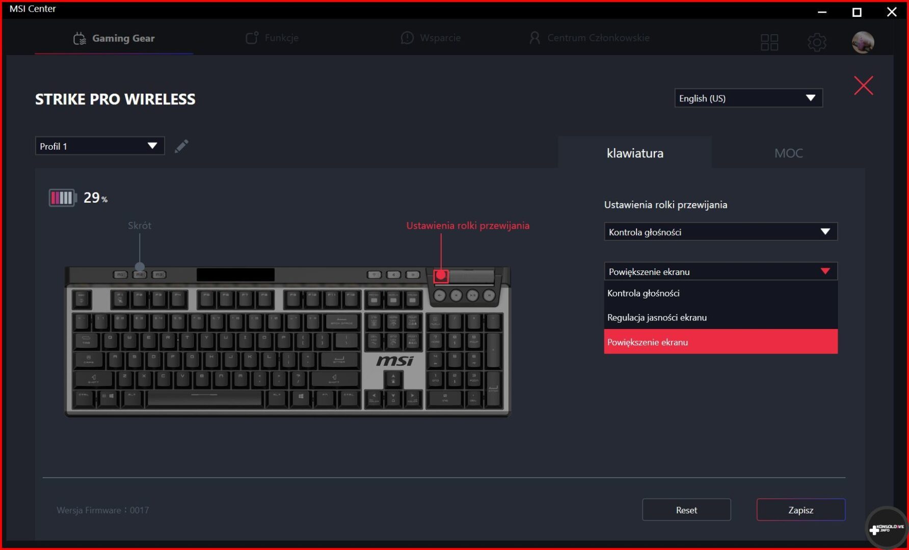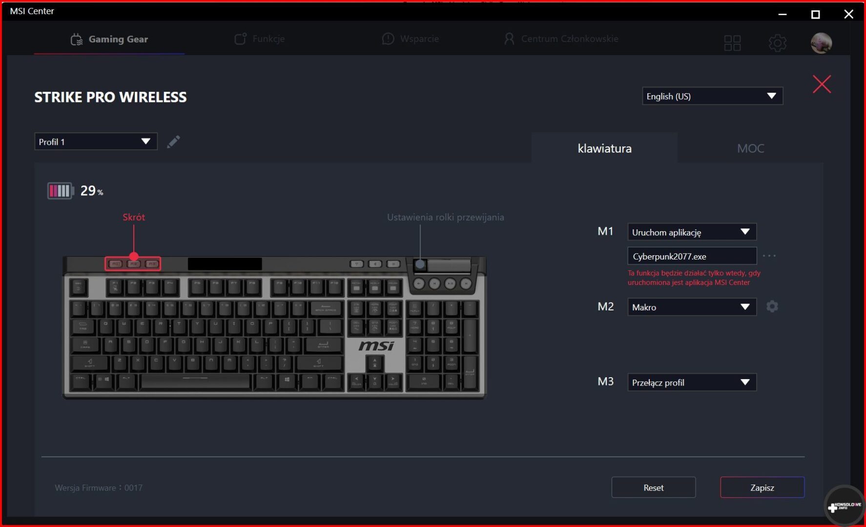 Zarówno myszka, jak i klawiatura pozwalają na dostosowanie pewnych funkcji poprzez aplikację MSI Center. Zanim jednak będziemy w stanie oddać się personalizacji, należy zaktualizować oprogramowanie sprzętowe. Niestety proces ten jest w mojej ocenie nie potrzebnie uciążliwy. Przede wszystkim nie dokonamy tego, podłączając sprzęt przez Bluetooth – ok, byłbym w stanie ro zrozumieć. Myślicie więc, że wystarczy przełączyć się na łączność radiową i wpiąć dongle? Bynajmniej, nic z tych rzeczy. Musicie wpiąć dongle, a dodatkowo podłączyć akcesorium za pomocą przewodu. Nie zadziała też samo podłączenie kablem – aktualizacja firmware’u wymaga wpięcia tak dongle’a, jak i przewodu. Sprawia to, że chcąc zaktualizować jedynie klawiaturę lub myszkę, musicie zająć dwa porty USB – należy mieć to na uwadze. Jeśli natomiast chcecie jednocześnie zaktualizować i klawiaturę, i myszkę., to „znikają” Wam 4 porty. Jest to bardzo mało wygodne i nie odpowiadało mi już podczas recenzowania pada MSI. Szkoda, że tutaj zdecydowano się na takie samo rozwiązanie.