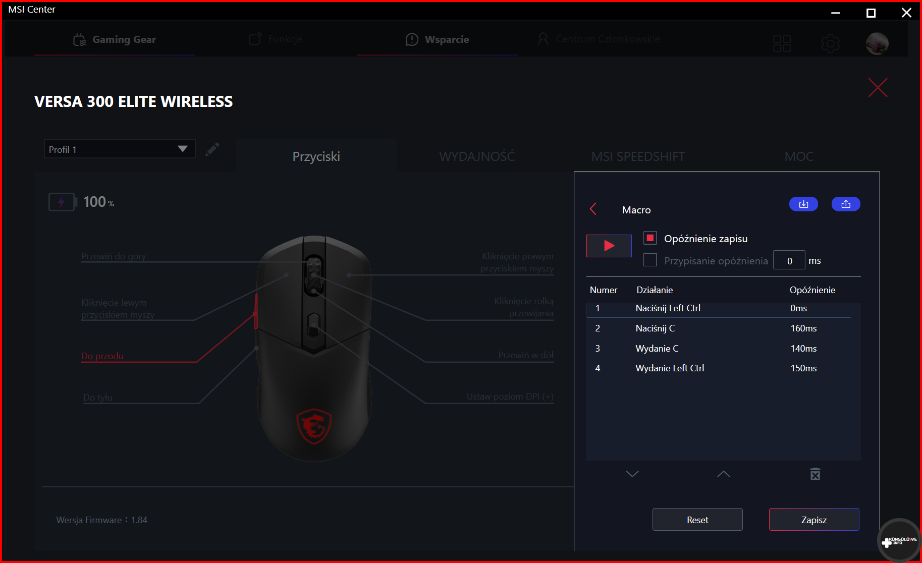 Kiedy już zaktualizujecie oprogramowanie systemowe sprzętów, będziecie mogli dostosować ich podświetlenie. Niestety nie mamy do dyspozycji pełnej palety RGB i aplikacja MSI Center pozwala zaledwie na ograniczone dostosowanie wyświetlania. O ile w przypadku myszki byłbym to w stanie przełknąć – choć z trudem – to absolutnie nie odpowiada mi to odnośnie klawiatury. Miałem nadzieję na ustawienie koloru każdego przycisku z osobna, aby klawiatura wyświetlała logo Batmana lub Montreal Canadiens. Niestety, nie było to możliwe. Można za to dostosować działanie dodatkowych przycisków myszki i nawet rejestrować proste makra oraz przypisać do klawisza włączanie konkretnego programu. Nie udało mi się jednak przypisać do jednego z przycisków opcji „Kopiuj”, a do drugiego – „Wklej”. Personalizacja ustawień recenzowanych dziś akcesoriów jest bardzo podstawowa i nie uważam, że należy wybrać te sprzęty, nastawiając się na głębokie dostosowanie ich działania i wyglądu podświetlenia. Możliwość przypisania DPI zależnie od wybranego profilu jest przydatna, aczkolwiek aplikacja odznacza się sporym niewykorzystanym potencjałem.
