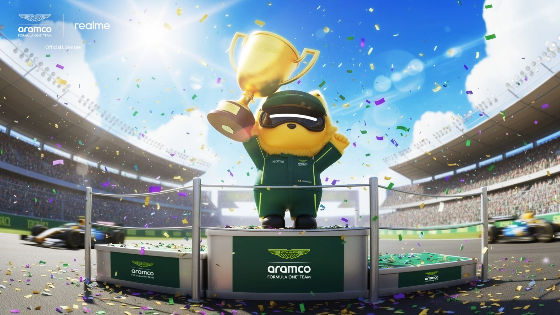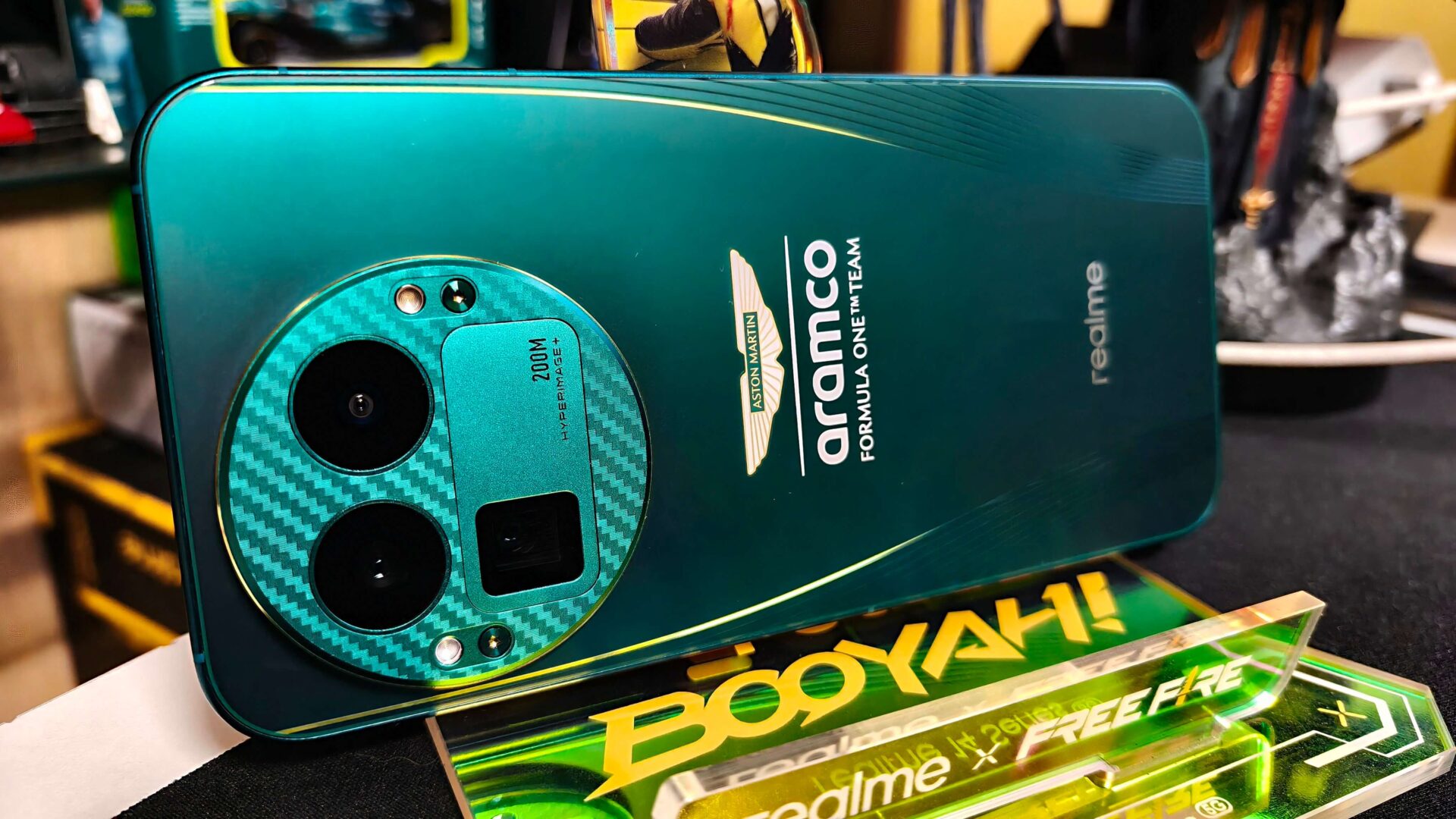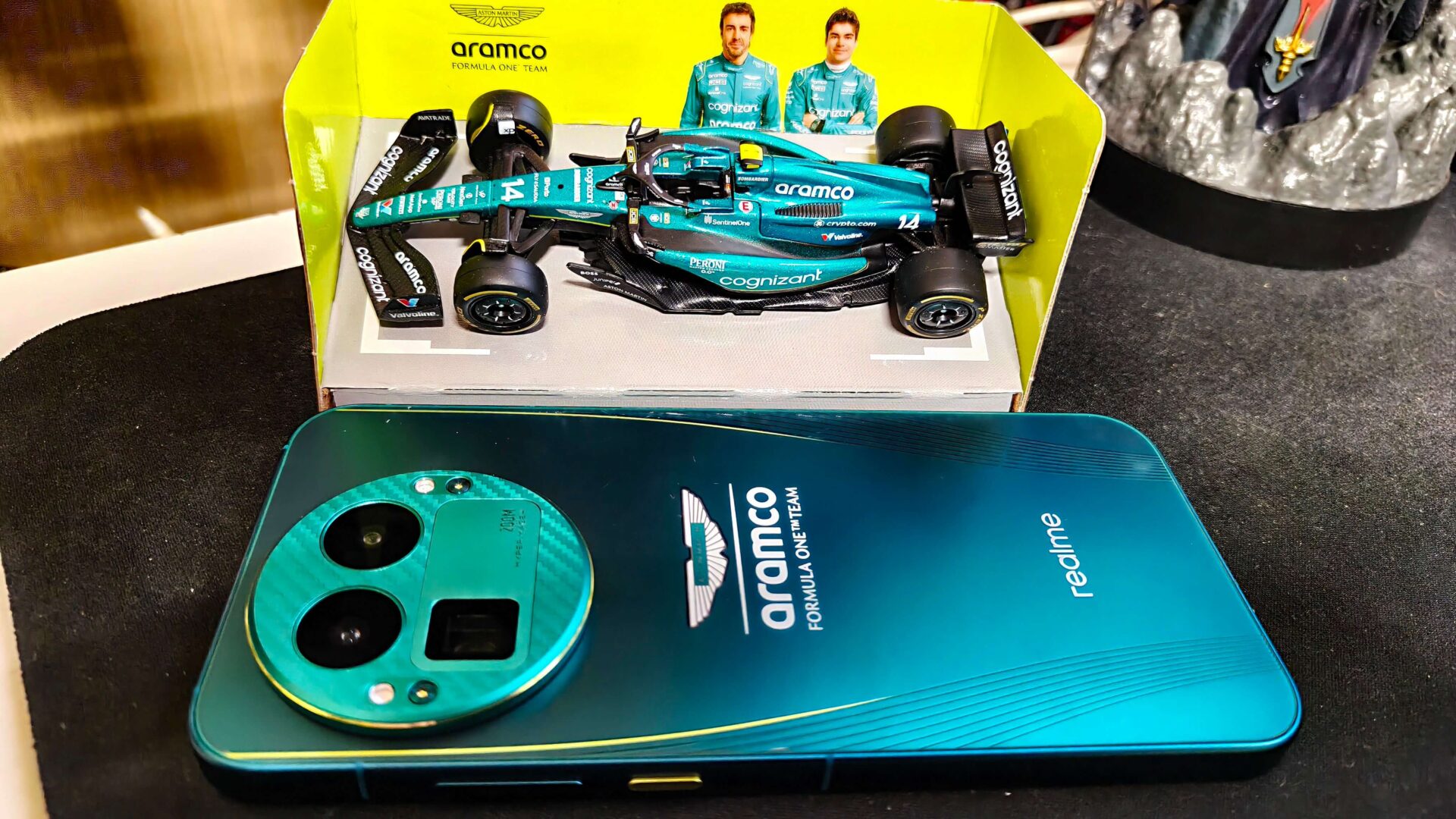 Pudełko Dream Edition zaprojektowano i pomalowano w charakterystycznym kolorze nazwanym Aston Martin Racing Green. Nie mogło zabraknąć na nim seledynowych linii (Lime Essence) oraz dużej nazwy sponsora, którym jest firma Armaco. Unosząc wieczko do góry, zobaczymy szkic przodu bolidu, gdzie w oponie wkomponowano wysepkę z aparatami. Troszkę szkoda, że pudełko nie zawiera żadnego gadżetu od zespołu Aston Martin Aramco. Fani F1 mogą liczyć tylko na unikatowe akcesoria od producenta smartfonu. Należą do nich kluczyk w kształcie bolidu F1 oraz dwa zestawy czarnych silikonowych plecków z logo realme, oraz zespołu Aston Martin Aramco. Oczywiście samo pudełko na półce prezentuje się jak milion dolarów i odwiedzający was znajomi z pewnością będą bardzo wam zazdrości takiego unikatowego zestawu.