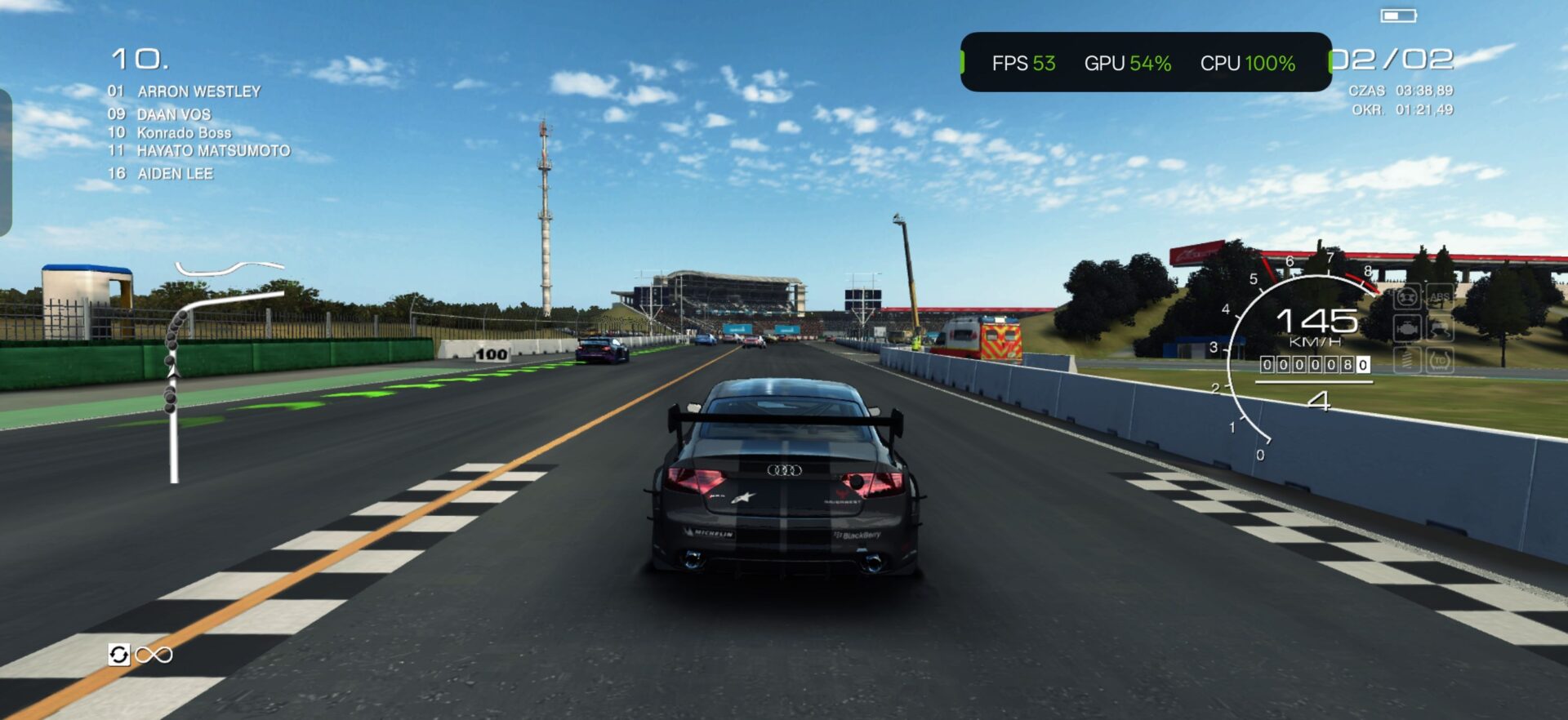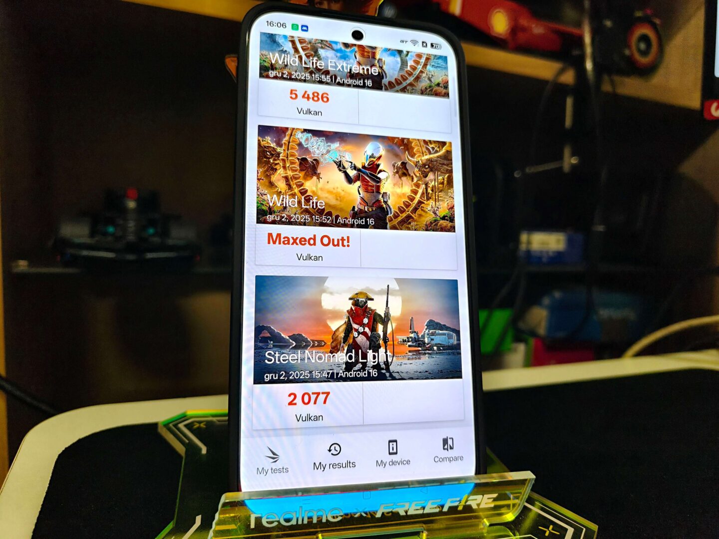 Zacznijmy od syntetycznych testów w mobilnych benchmarkach, które możemy porównać do testów kierowców wyścigowych w symulatorach. Na pierwszy ogień poszedł 3DMark i test Steel Nomad Light, czyli bardzo wymagający test obciążeniowy zintegrowanych układów graficznych bez śledzenia promieni w rozdzielczości 1440p. Mój testowy egzemplarz GT 8 Pro uzyskał tutaj cyberpunkowy wynik 2077 punktów. Natomiast test Wild Life Extrema dał wynik 5486 ze średnią liczbą 32 klatek. Jest to wynik, który plasuje moje urządzenie wśród 6% najlepszych smartfonów.