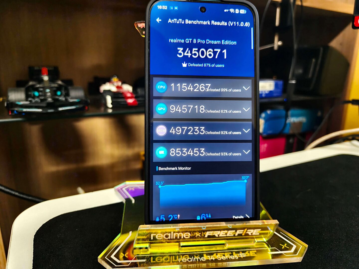 Natomiast w AnTuTu v11 urządzenie zdobyło 3450671 punktów, co tylko plasuje je w ścisłej czołówce konstruktorów flagowych smartfonów. Najlepiej wypadł CPU, który zdeklasował całą konkurencję i jest lepszy od 99% smartfonów. Podczas testu temperatura wzrosła o zaledwie 5 stopni, z 32,5 na 37,7. Co prawda to tylko suche liczby z testów syntetycznych, ale już one pokazują nam, ze realme kończy rok 2025 mocny uderzeniem, posiadając jeden z najmocniejszych smartfonów na rynku. Pracownicy z realme niczym najwybitniejsi inżynierowie z F1 pokazali, że nie ma dla nich rzeczy nie możliwych. Z GT 8 Pro żaden scenariusz nie będzie dla was zaskoczeniem.