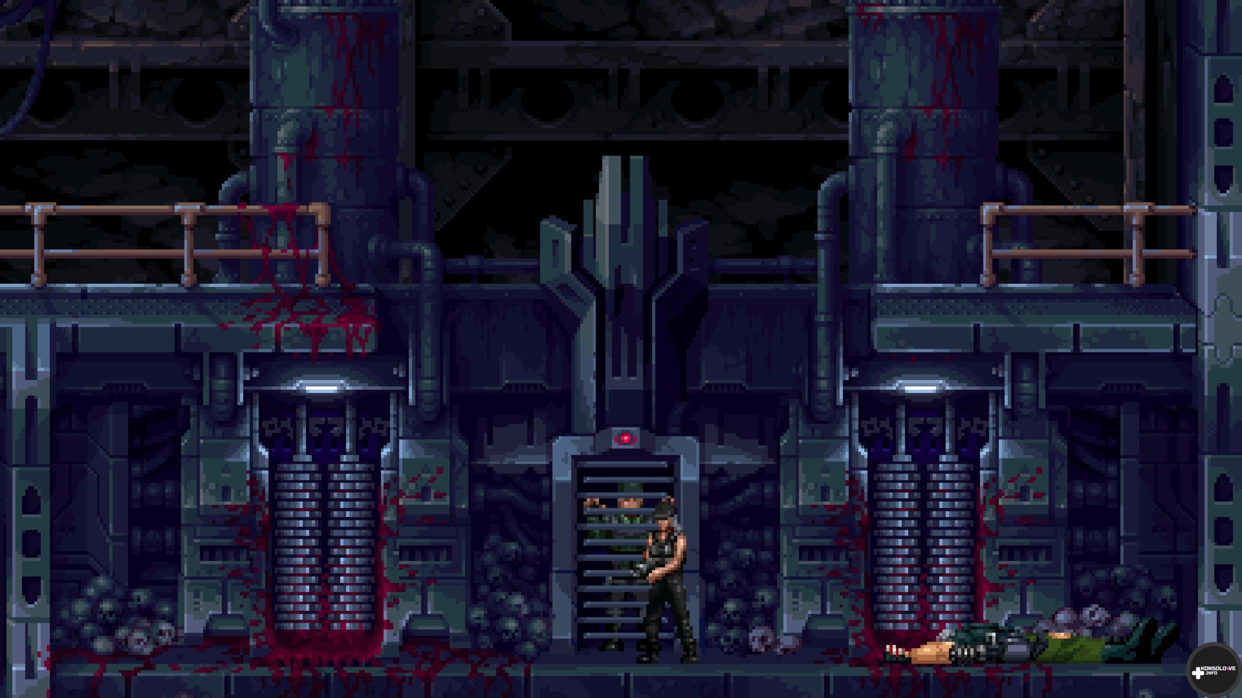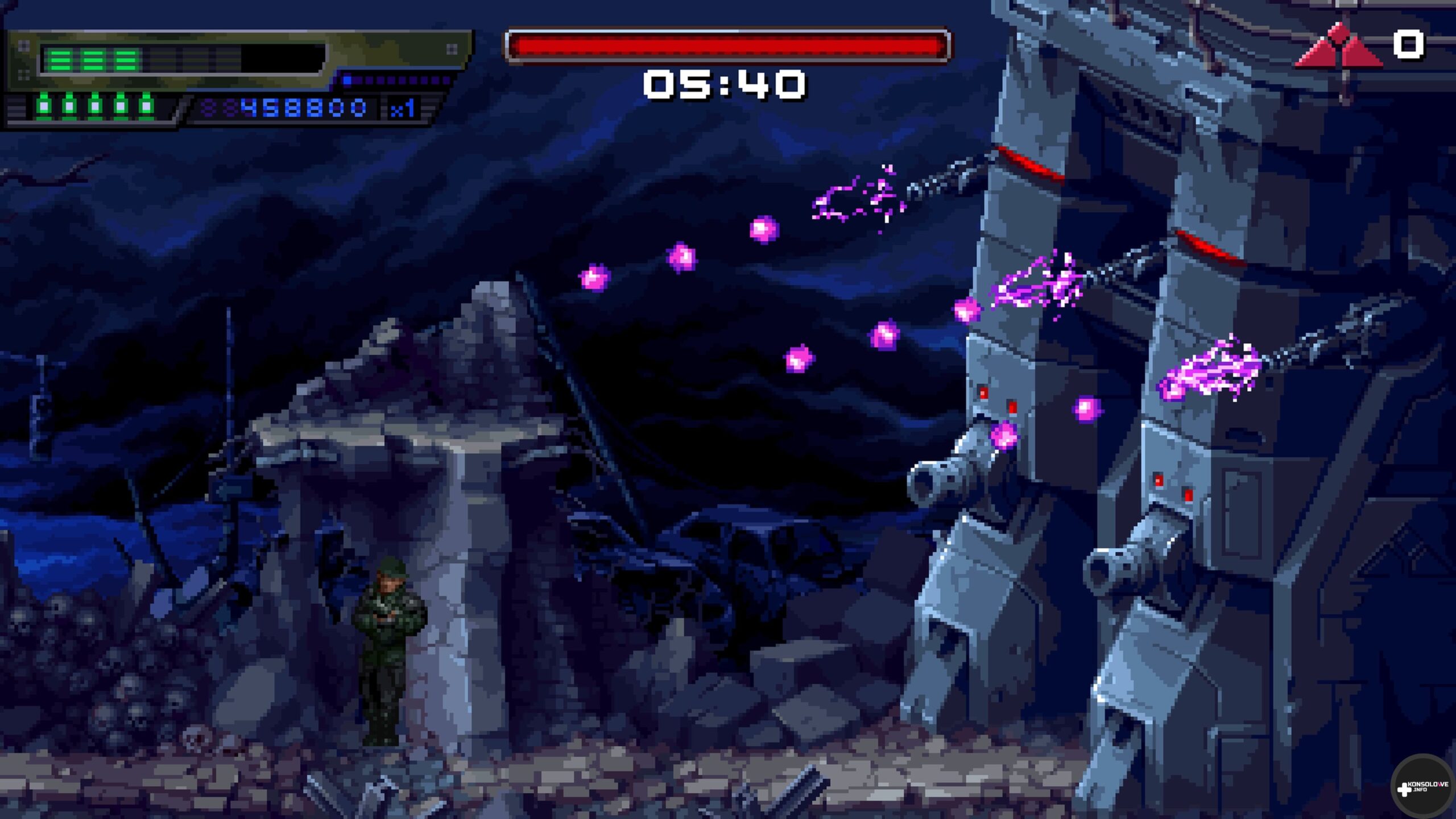 Jak możecie się domyślać po zrzutach ekranu – oraz po powyższym materiale filmowym – rozgrywka w Terminator 2D: No Fate jest nastawiona na akcję. Nie powinno być w tym niczego dziwnego. Przecież oryginalny materiał źródłowy obfitował w wysokooktanowe sekwencje. Przeniesienie ich na poletko gier powinno więc gwarantować sukces. Cóż, nie mogę się niestety zgodzić z taką tezą. Nie mam bynajmniej niczego przeciwko koncentracji na akcji – jak najbardziej rozumiem to, że nasze postaci przez większość poziomów chodzą z bronią i strzelają właściwie do wszystkiego, co się rusza. Gorzej natomiast, że wymiany ognia nie są na ogół niczym trudnym. W zasadzie poza starciami z bossami wystarczy w większości przypadków kucać i strzelać. Nasze bronie mają nieograniczony zapas amunicji – co jest w moich oczach zaletą – a co jakiś czas możemy znaleźć lepsze uzbrojenie. Na korzystanie z niego będziemy mieć pół minuty. Po upływie tego czasu wracamy do poprzedniej domyślnej broni.
