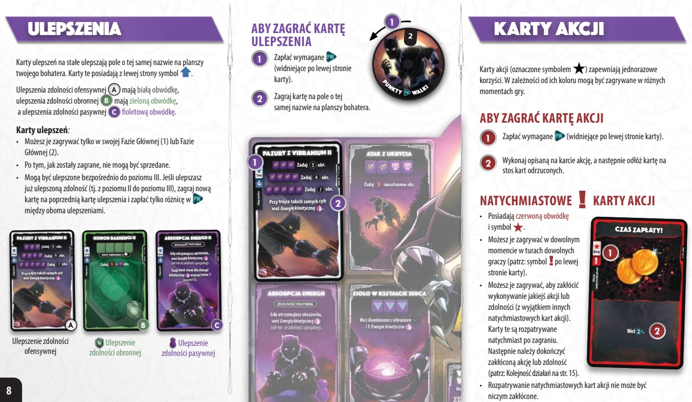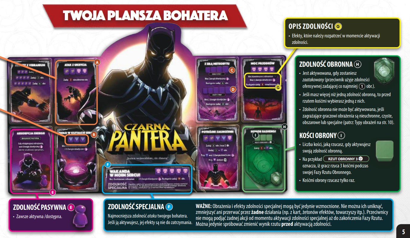 Każdy z wyżej wymienionych super bohaterów ma swój zestaw kości, talię i planszę. Gracze rzucając kośćmi, aktywują potężne zdolności i atakuj przeciwników. Zdobyte punkty walki możemy wydawać na ulepszenia lub karty akcji.
