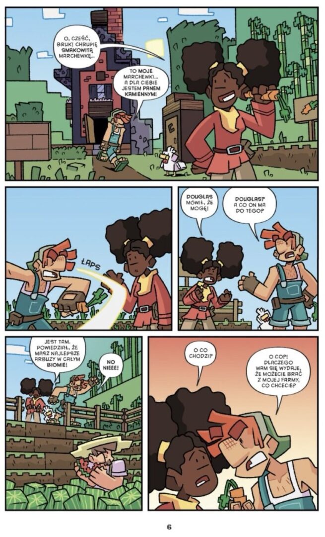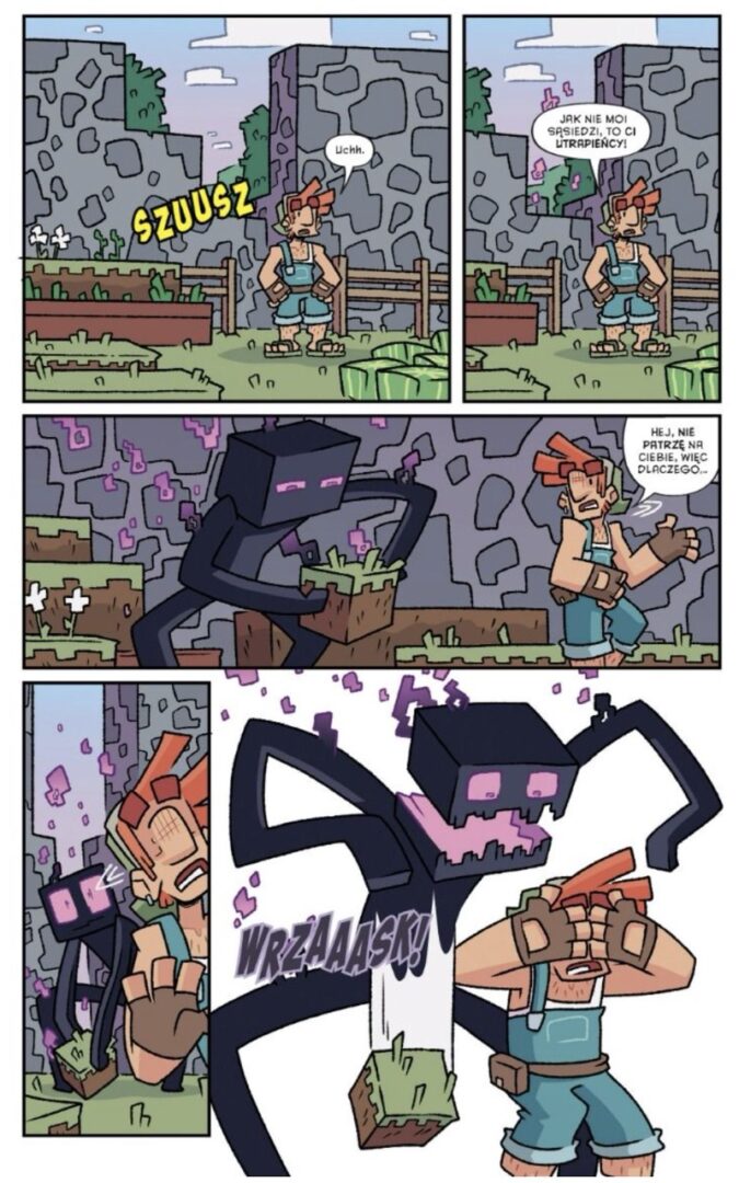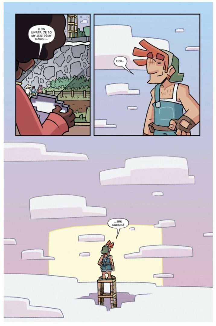Na uwagę zasługuje również warstwa graficzna. Projekty bohaterów wyraźnie odbiegają od tego, co znamy z gry. Nie mamy tu klasycznych, klockowych postaci. Zamiast tego twórcy postawili na własny styl artystyczny, który czerpie inspiracje z pierwowzoru, ale nie kopiuje go bezpośrednio. Całość ogląda się bardzo przyjemnie, a lekka, momentami wręcz bajkowa kreska łagodzi nawet bardziej emocjonujące sceny, czyniąc komiks przyjaznym dla młodszego odbiorcy.