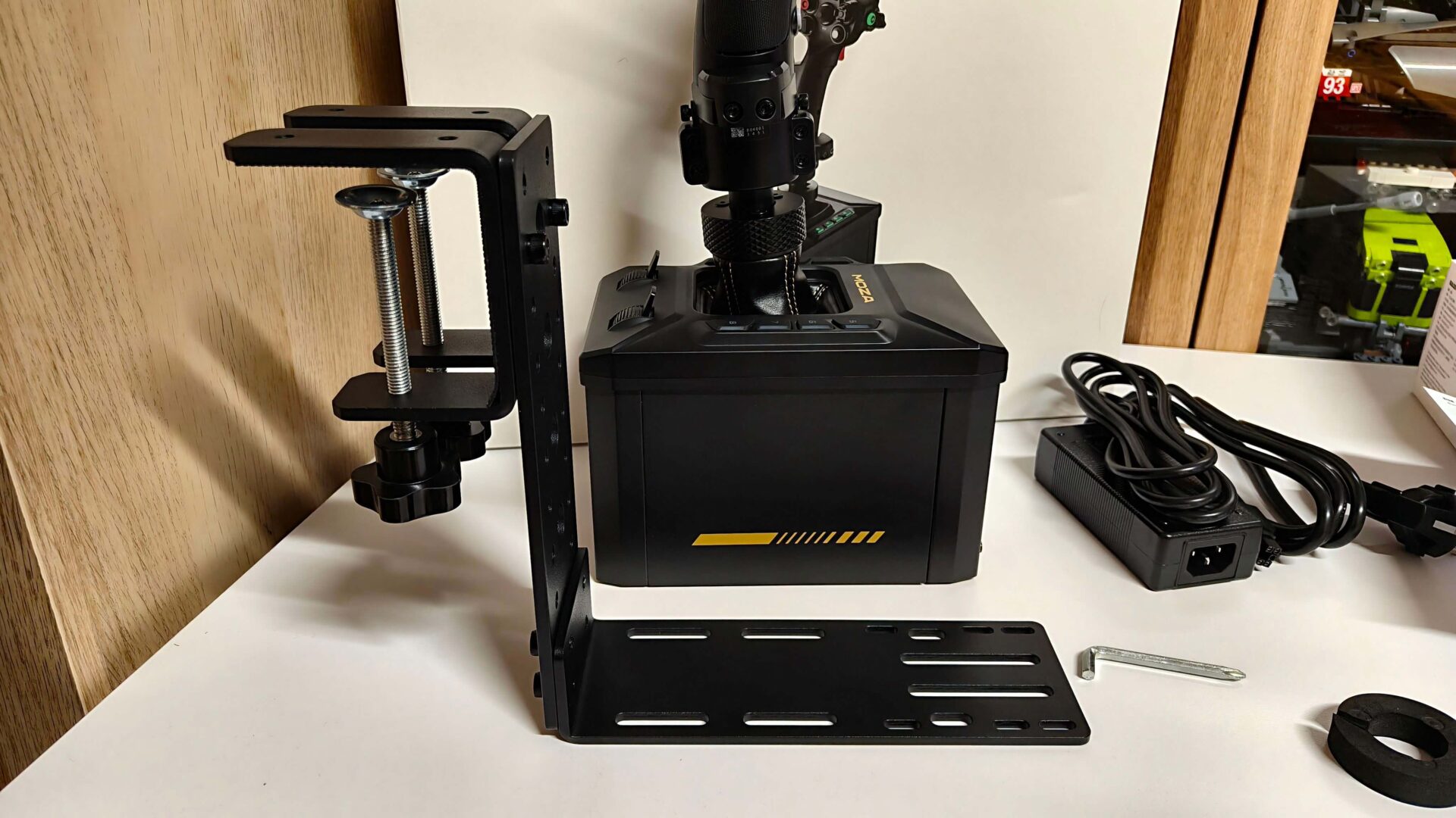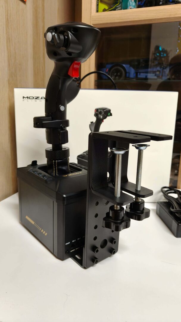 Ostatnią częścią MOZA AB6 Bundle jest metalowy zacisk stołowy. Bazy AB6 wraz z MHG flightstick nie da się postawić na biurku i wygodnie używać. Raz, że całość ma aż 37 cm wysokości, a dwa, siły działające na drążek będą powodować unoszenie całego zestawu. Stąd też jedną opcją jest przykręcenia bazy do zacisku stołowego, który następnie montujemy do blatu.