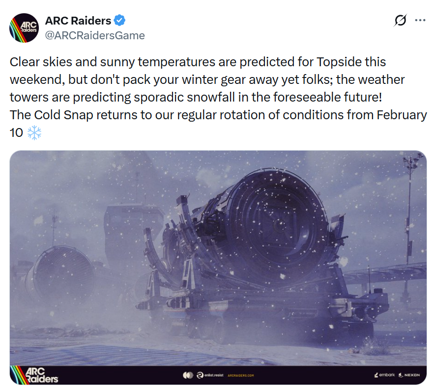 Tęskniliście może za mapami ARC Raiders pokrytymi śniegiem? Cold Snap już w przyszłym tygodniu zasili pulę regularnych warunków.