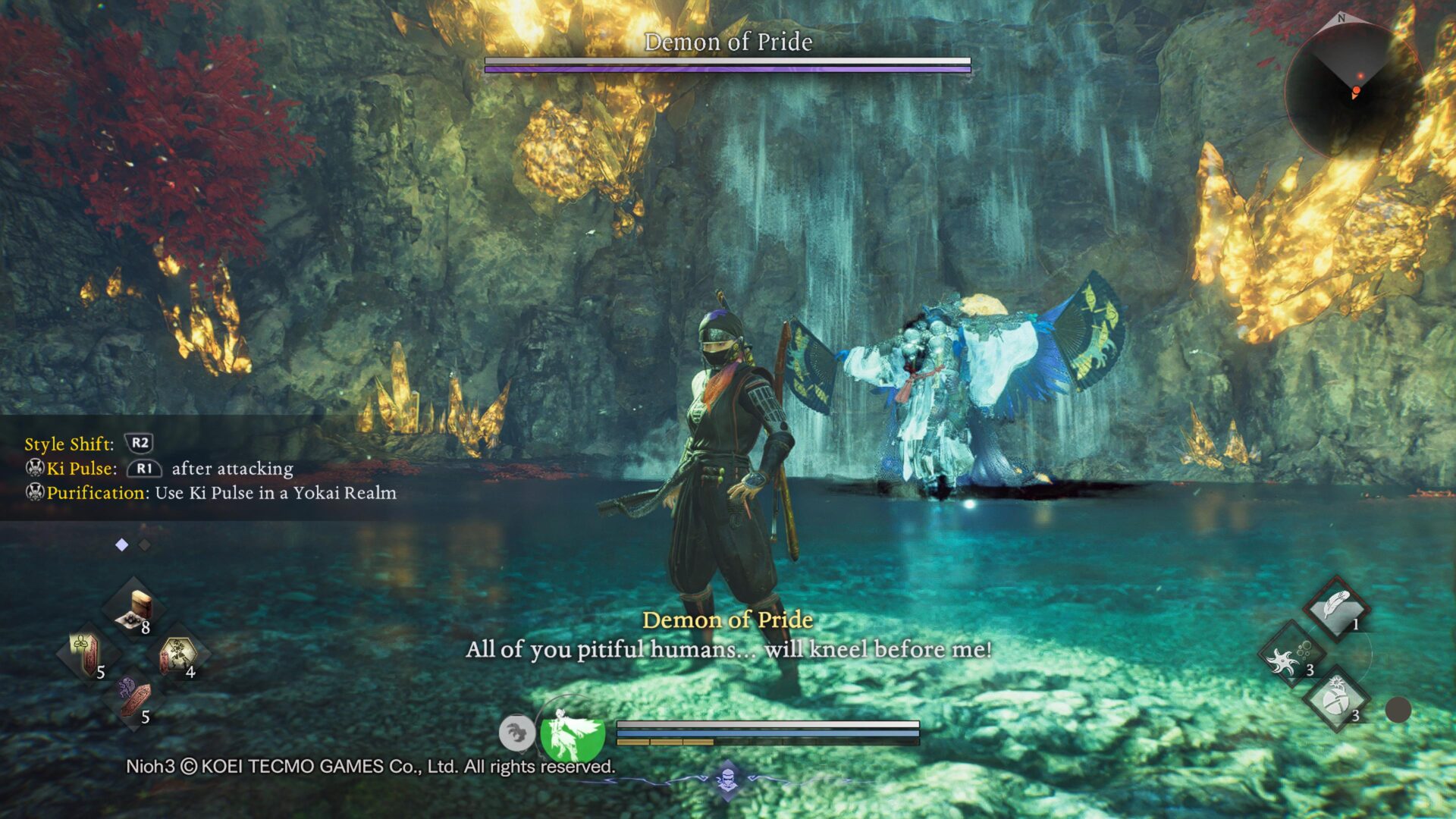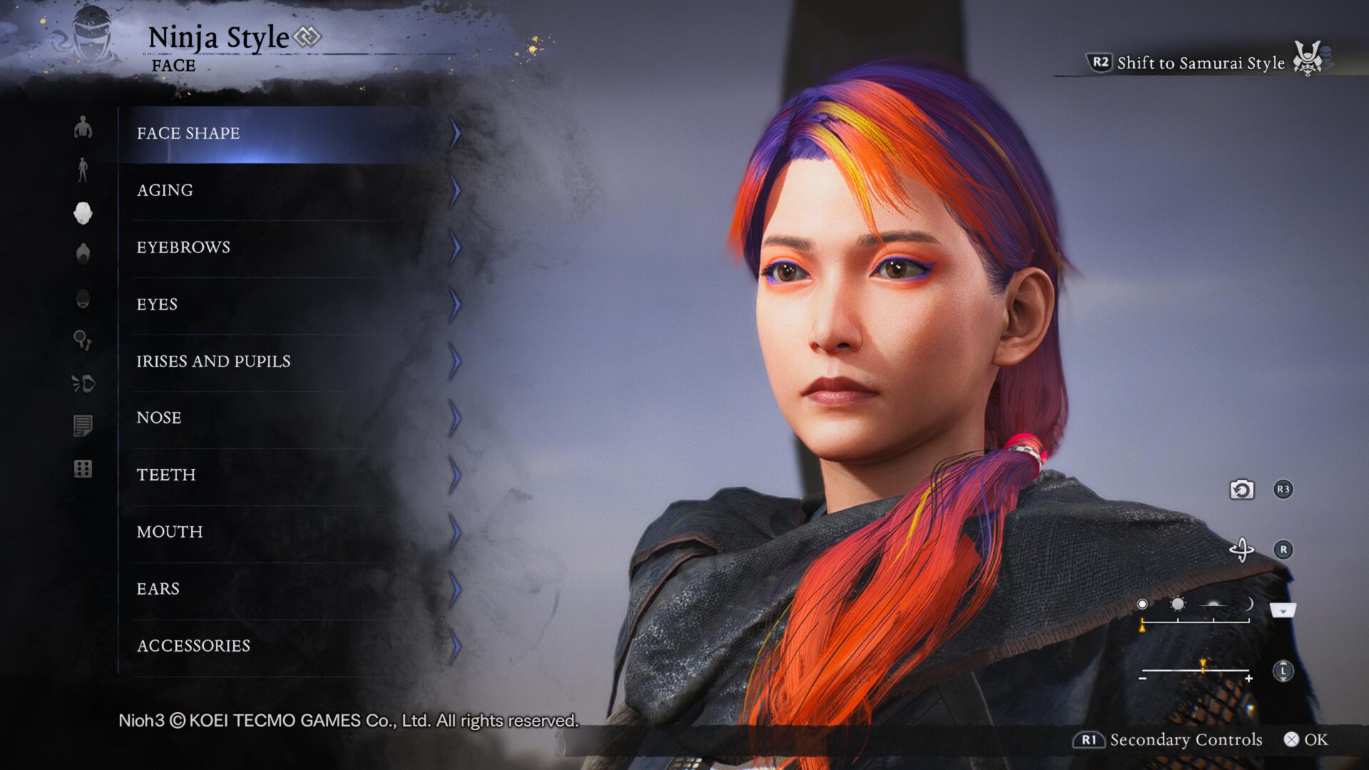 Przełączanie się między stylem ninja a samurajem jest błyskawiczne, wystarczy po prostu kliknąć R2. Przycisk ten towarzysz nam również w ekwipunku, czy drzewkach rozwoju. W Nioh 3 zbieramy osobny ekwipunek dla stylu ninja oraz osobny dla samuraja, nie ma możliwości przerzucania przedmiotów między stylami. Dzięki temu ekonomia gry jest dla nas bardzo hojna, gdyż otrzymujemy dużo przedmiotów, które możemy sprzedać za złoto lub przerobić na amritę potrzebną do awansowania na wyższy poziom.