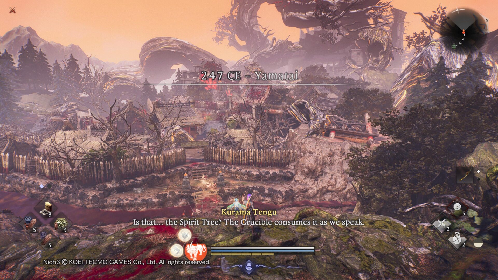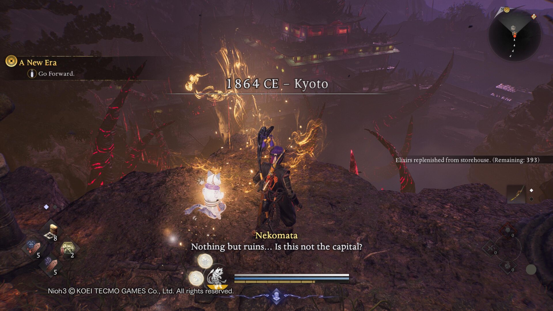 Co ciekawe fabuła nie jest aż tak liniowa, jak w poprzednich dwóch częściach. Co ważne, nie musisz znać historii, a nawet mechaniki rozgrywki z Nioh 1 i 2. Trzecia odsłona jest bardzo przyjazna dla nowych graczy, zarówno pod względem opowieści, jak i rozgrywki. Przyzwoitym urozmaiceniem jest możliwość podróżowania w czasie. Zaprezentowana historia rozciąga się na różne epoki i regiony. Odwiedzimy m.in. Zamek Edo, region Tōtōmi z okresu Sengoku, a także Kyoto, czyli stolicę z okresu Heian. Przygodę kończymy w erze Bakamatsu (ostatnia era samurajów), do której dotarcie zajęło mi aż 60 godzin. Z jednej strony czyściłem wszystkie poprzednie regiony niemal na 100%, a z drugiej napotkane problemy techniczne skutecznie utrudniały i wydłużały moją rozgrywkę.