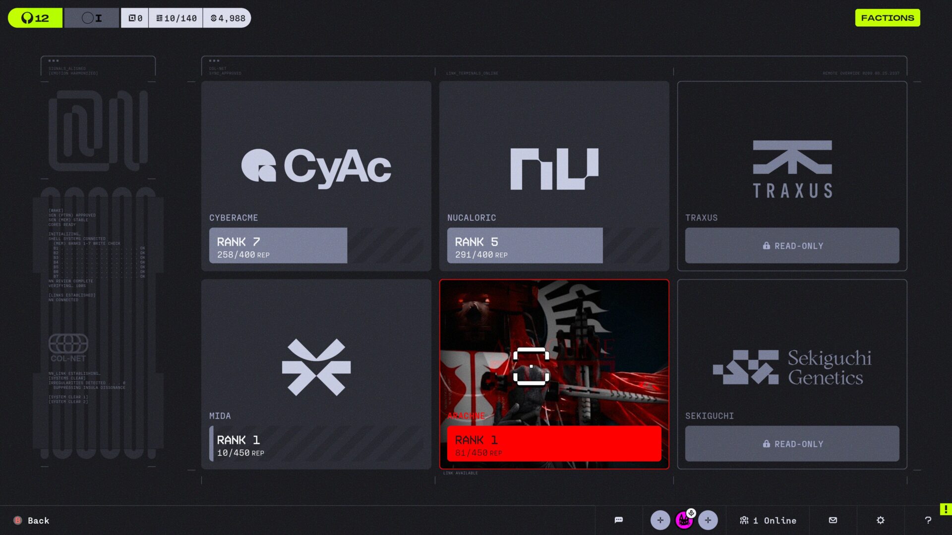 Jak i frakcje, tak i kontrakty. Misje w grze podzielone są na priorytetowe i poboczne. Te pierwsze to misje fabularne, wykonywane w konkretnej kolejności w obrębie każdej frakcji. Na początku więc eksplorować będziemy głównie misje dla CyAc, co pozwoli nam “nawiązać połączenia” z pozostałymi.