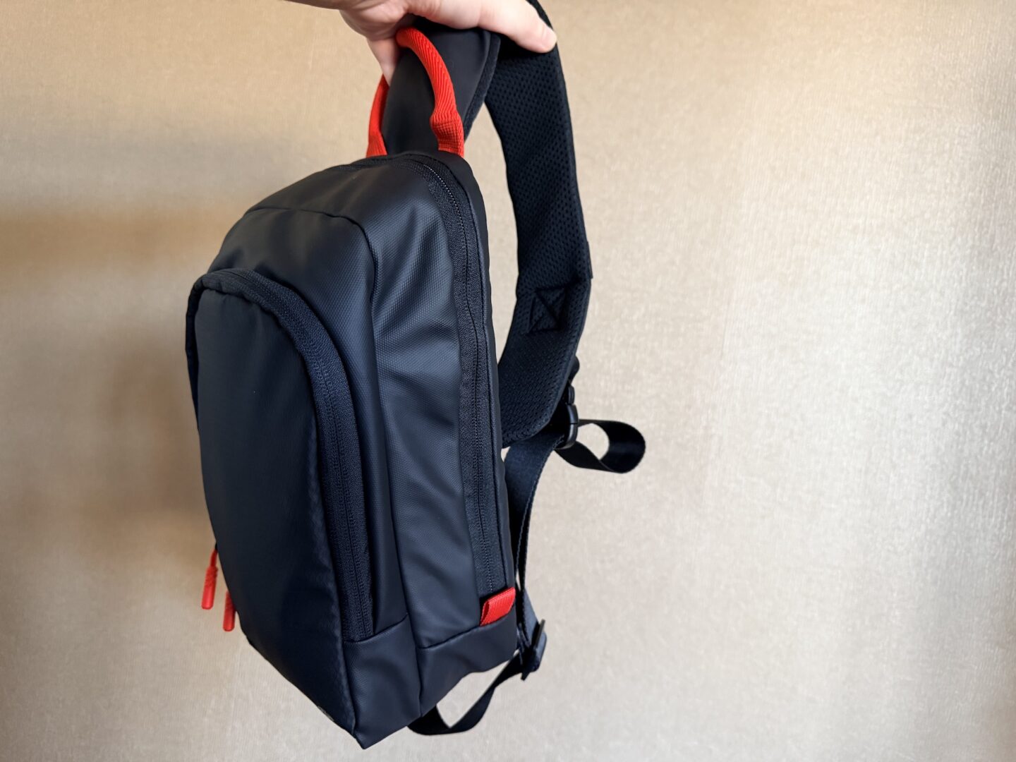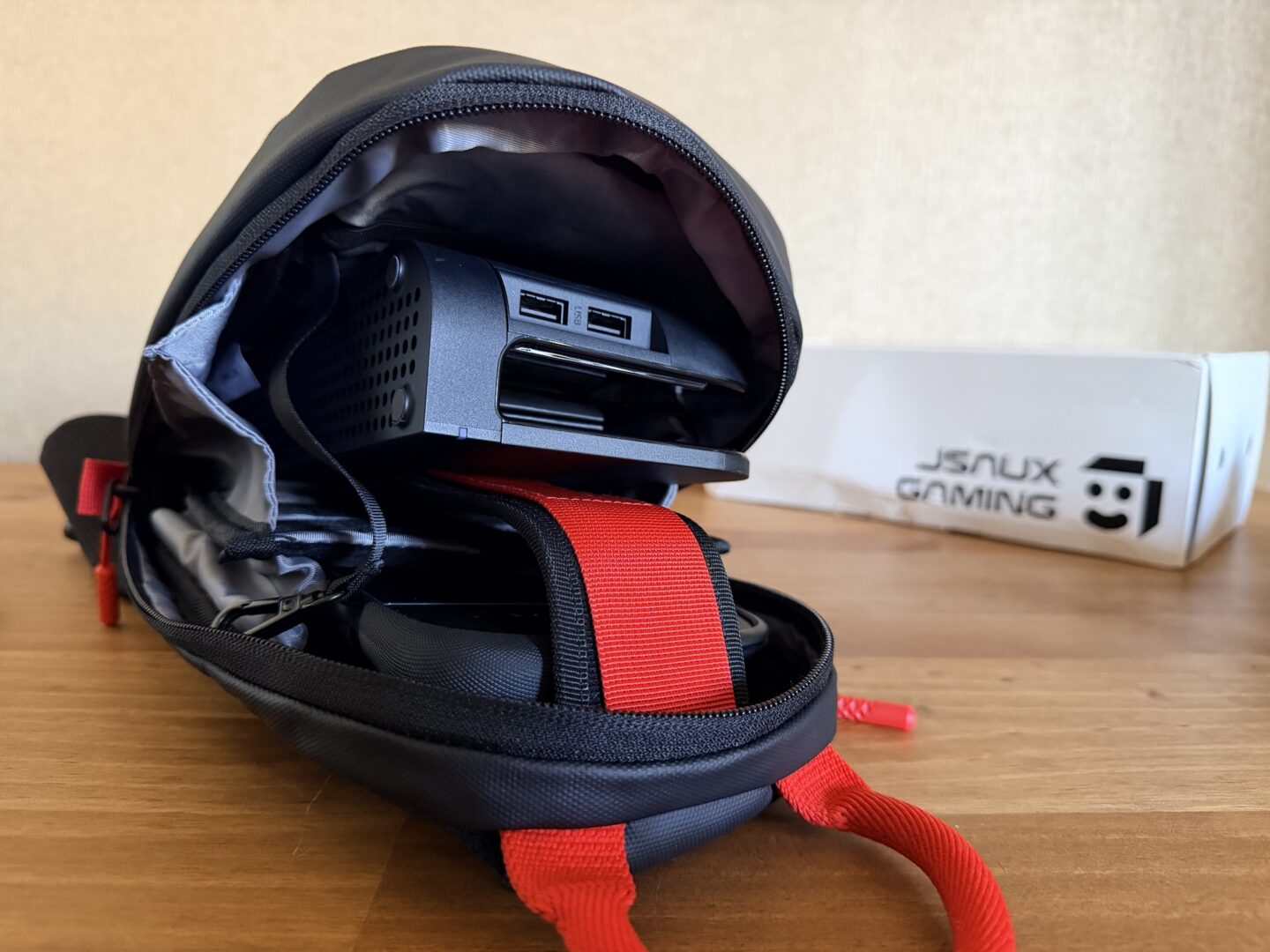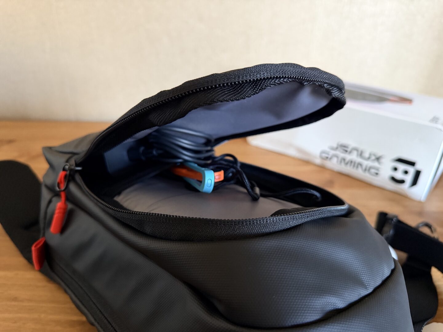 Torba Crossbody Sling Bag to moim zdaniem świetne akcesorium dla graczy, którzy potrzebują dedykowanego plecaka na swoją przenośną konsolę. Dzięki specjalnemu separatorowi w środku gałki naszego handhelda będą bezpieczne, a dodatkowe miejsce możemy przeznaczyć na nieodzowne akcesoria, które po normalnym plecaku latałyby bez ładu i składu. Sling Bag pomieści nawet ponad dwa razy grubszego od Switcha ROG Xbox Ally!