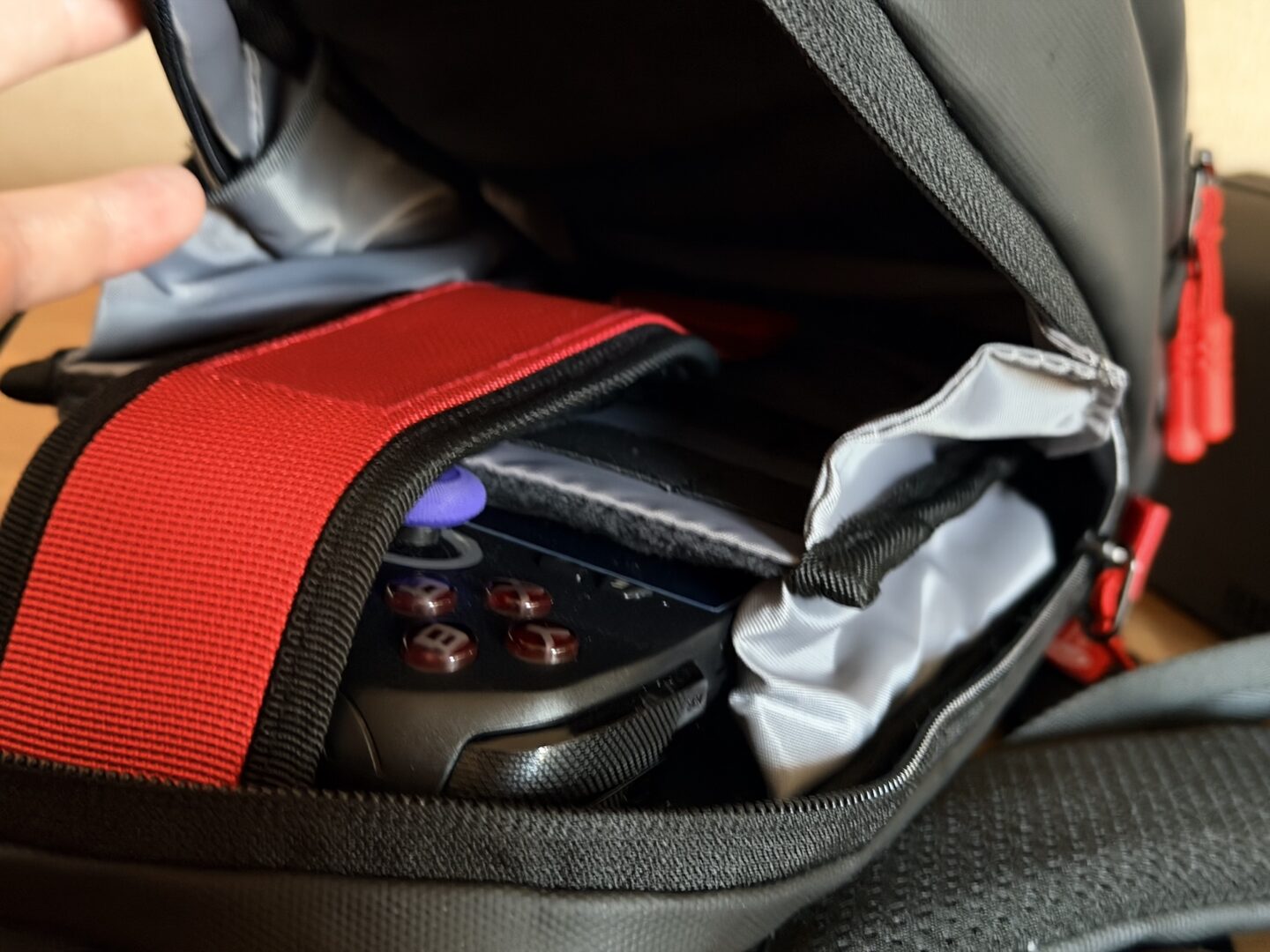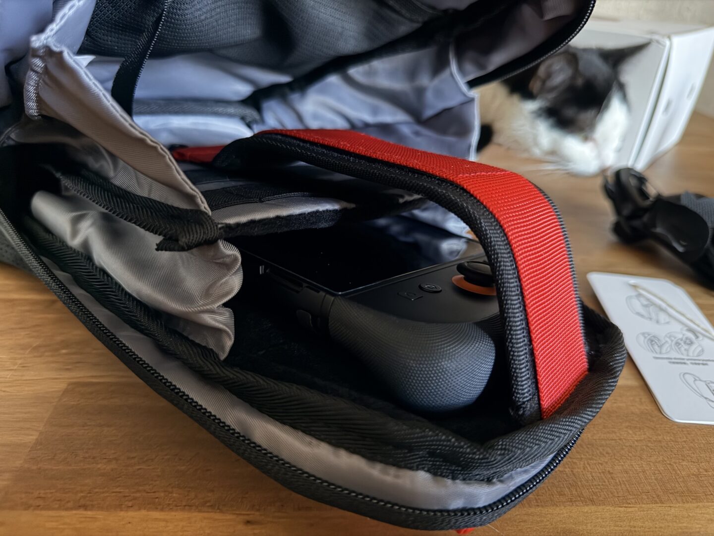 Wiele przegródek i kieszeni w środku plecaka ułatwia natomiast przenoszenie dodatkowych akcesoriów. Mamy tu większą, główną przegrodę na konsolę i pada, z kolei zasuwana kieszeń na froncie pomieści ładowarkę i inne pomniejsze dodatki. Znajdziemy tu również kieszonki na 9 kartridży z grami na Switcha. Pasek na ramię możemy natomiast przepiąć z lewej i prawej strony torby.