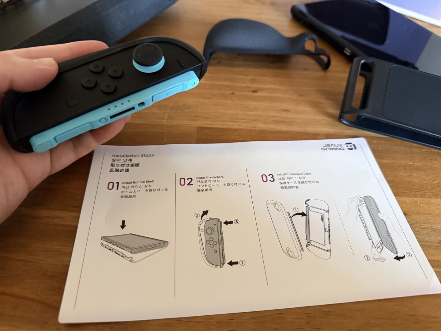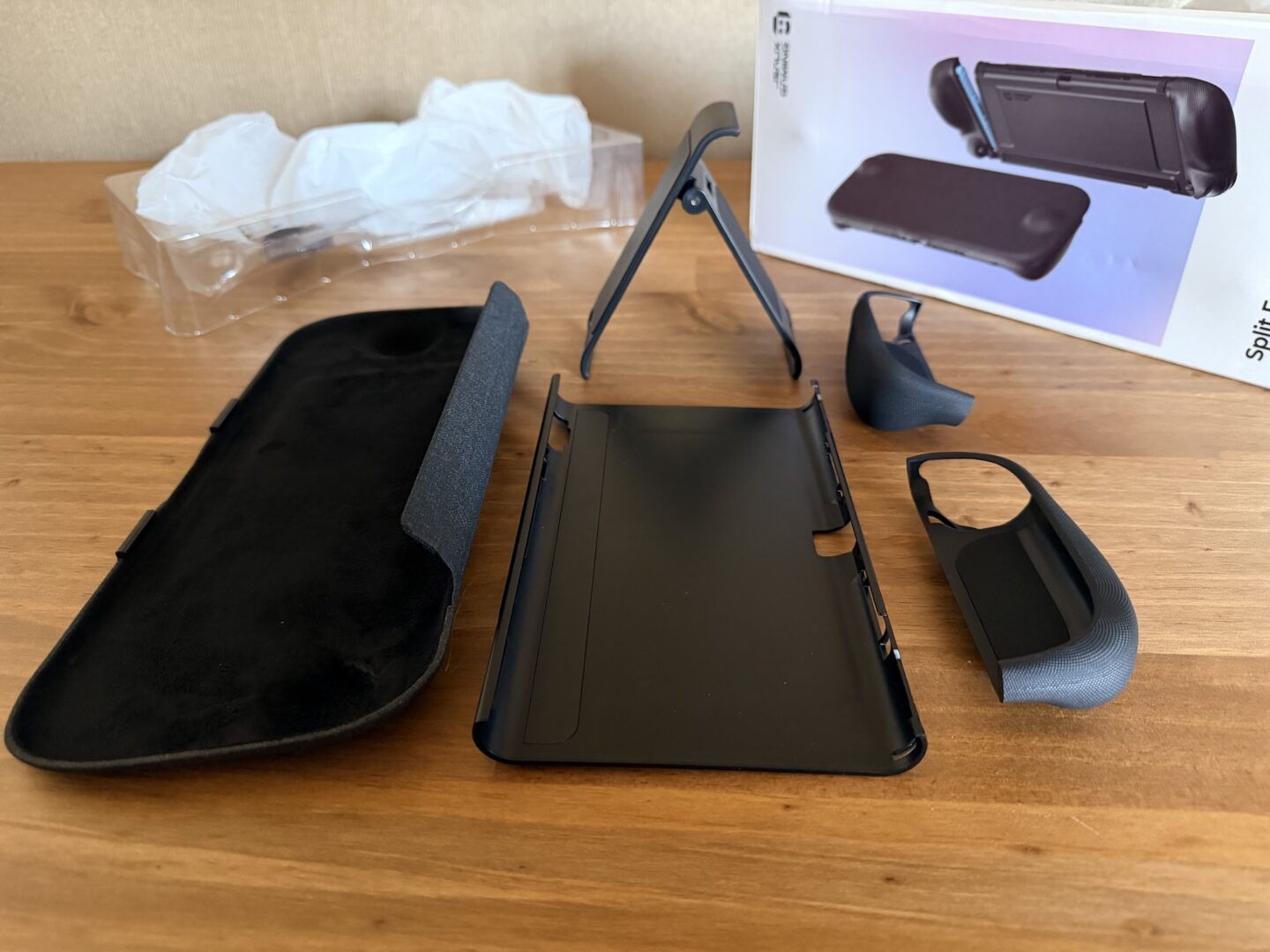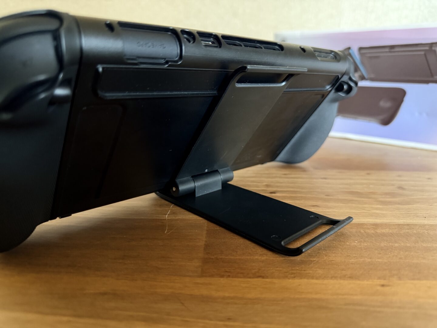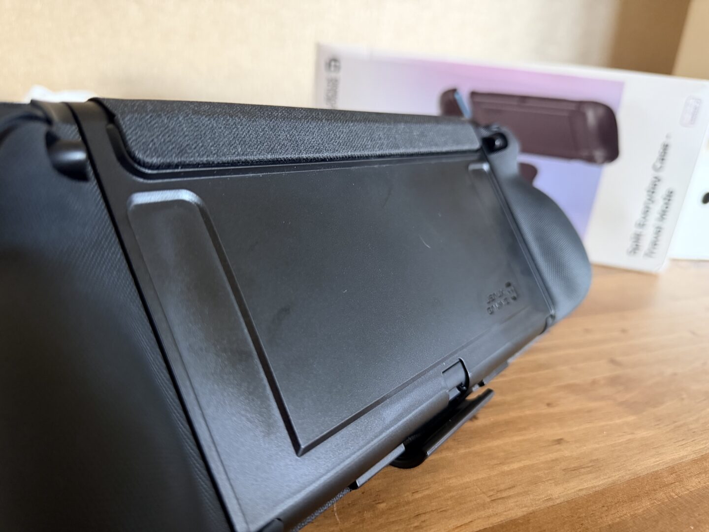 Ze wspomnianym plastikowym etui wiąże się największa moim zdaniem wada Split EveryDay Case. Mianowicie, zablokowane zostaje korzystanie z wbudowanej w tył konsoli podstawki. Z pomocą przychodzi osobna podstaweczka dołączona do zestawu, jednak jest to dodatkowy element poza konsolą i zbyt łatwo ją gdzieś zapodziać. Pochwalę natomiast, że etui jest kompatybilne z oficjalnym dockiem do Switcha 2.
