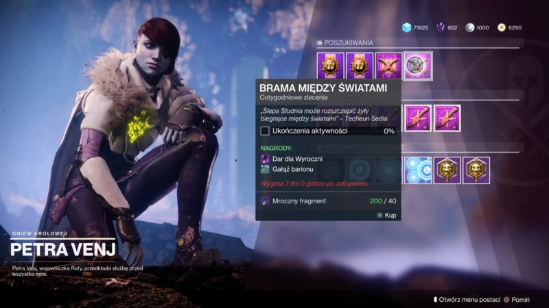 - Brama między światami – musicie ukończyć Ślepą Studnie w 100%. W tym tygodniu waszym przeciwnikiem będzie Rój, końcowym bossem będzie Ogr, a w wydarzeniu heroicznym na trzecim poziomie przywołacie dwa ogromne Ogry na 580 światła. Zabicie tych dwóch ogrów nagrodzi was dodatkową potężną nagrodą ze skrzyni. – Ta aktywność nie daje potężnego engramu, tylko „Dar dla wyroczni”.