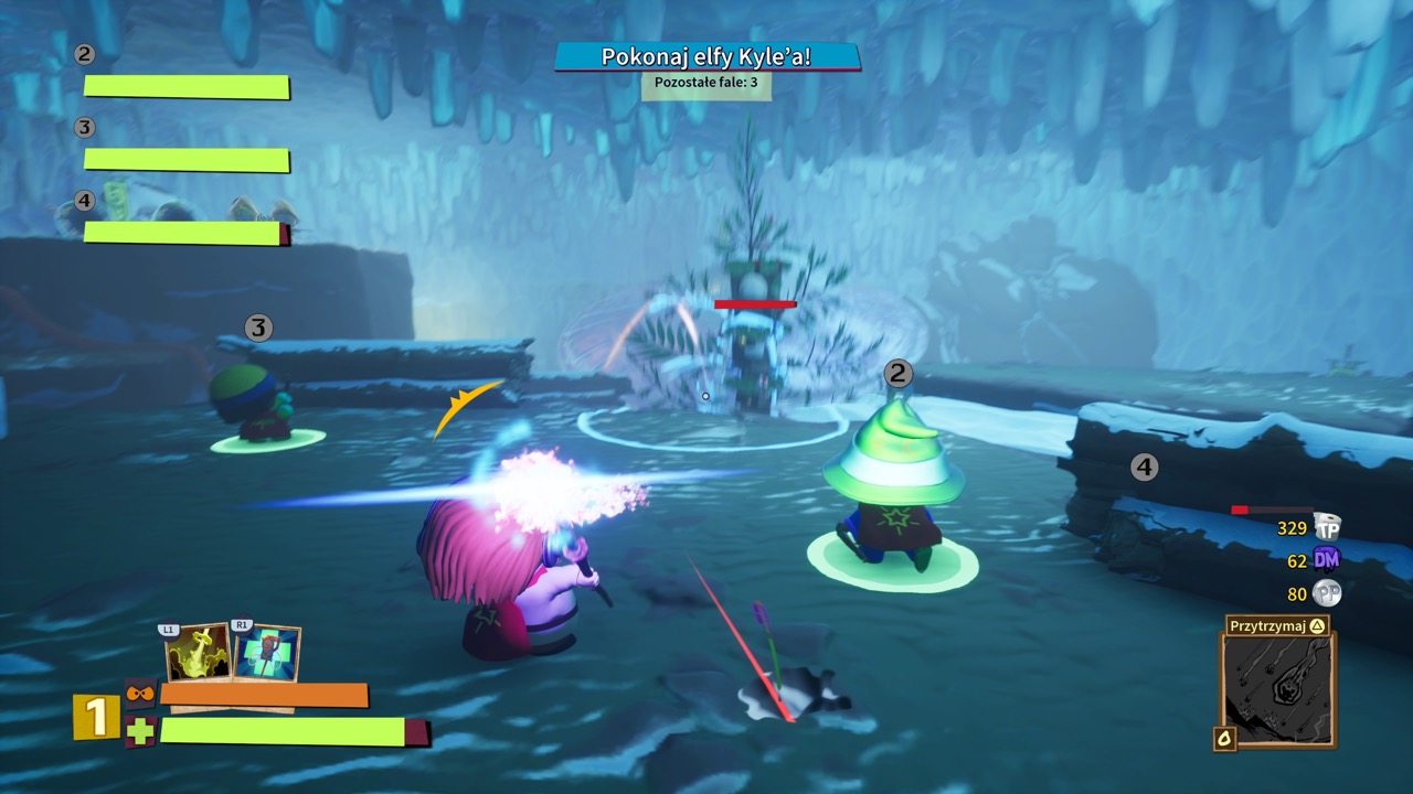5 misji może wydawać się małą liczbą, ale gra ma w sobie elementy tytułu rougelike. Każdej podejście do misji jest więc inne. Możemy nie tylko wybrać różną broń białą i dystansową, ale też różne dodatkowe moce. Do tego przy rozpoczynaniu misji mamy możliwość dobrania kart ulepszeń czy przepotężne karty przeginki (po angielsku nazwane bullshit), które nieźle potrafią namieszać. Jest to najczęściej jednorazowa umiejętność, która potrafi przechylić szalę zwycięstwa na naszą korzyść. Wszystkie karty przedstawione są w formie rysowanych przez dzieci obrazków. Są one wyjątkowo urocze i myślę, że gdyby dostępne były w formie fizycznej w sprzedaży albo np. jako element edycji kolekcjonerskiej, to sporo osób mogłoby po nie sięgnąć.