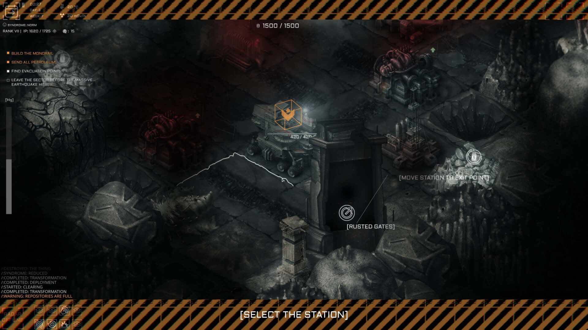 Podczas naszej tury możemy zmieniać pozycję naszej stacji (w trybie mobilnym) lub stawiać czy ulepszać budynki. Nie zobaczymy tu typowego w strategiach “fog of war” czy zasięgu budowania, bo mapy są ciasne i odblokowywanie siatki jest jednym z głównych zadań.
